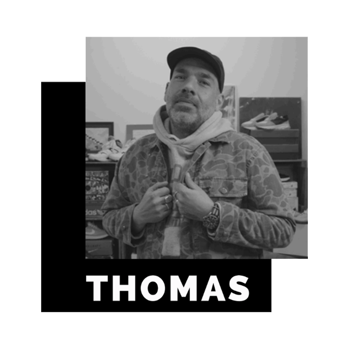 La communauté des fans d’Elle Est Bonne Sa Paire l’a baptisé “Le Fabuleux”. Mais comment en sommes-nous arrivés là ? Journaliste, styliste, DA, artiste en peintures murales, co- fondateur de la marque de vêtements Bleu de Paname, Thomas Giorgetti est multi-talents mais mono-obsession : il n’a jamais cessé d’être passionnée par la sneaker. Détenteur d’une collection qui contient des paires historiques, emblématiques, étonnantes, rares (dont certaines cotées à des sommes indécentes), il ne rechigne jamais à une petite expédition dans un outlet discret au bord d’une départementale normande. Si son stock de paires d’époque nourrit souvent les Trésors d’Elle Est Bonne Sa Paire, Thomas n’est pas resté bloqué au rayon nostalgie. Il reste à l'affût des nouveautés et curieux comme au premier jour. Fabuleux, on a dit.